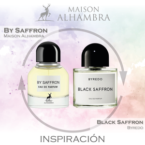 By Saffron de Maison Alhambra es una fragancia de la familia olfativa Aromática Especiada para Hombres y Mujeres. By Saffron se lanzó en 2022. Las Notas de Salida son bayas de enebro, azafrán y toronja (pomelo); las Notas de Corazón son cuero, violeta negra y rosa; las Notas de Fondo son frambuesa, vetiver y Maderas transparentes.